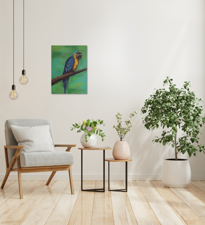 Krásný den! Já jsem papoušek Ara ararauna. Nemusíte se bát, že vám uletím. Jsem tu pro vaše potěšení.